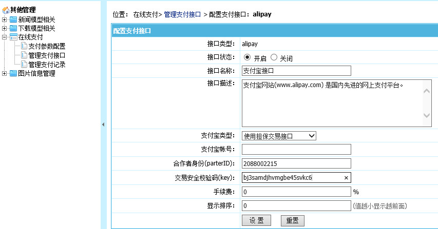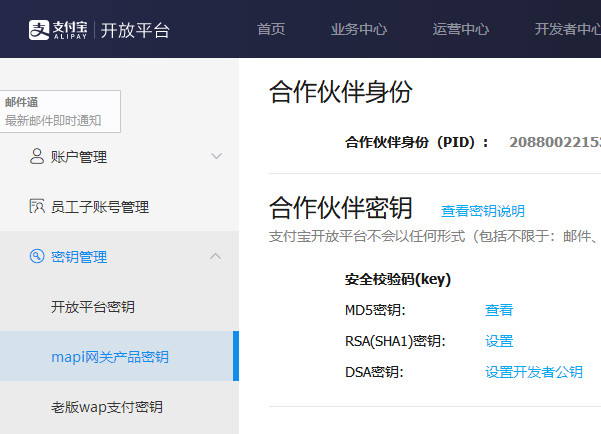 填写支付宝账号,MD5密钥,rsa密钥。测试时还是有问题。