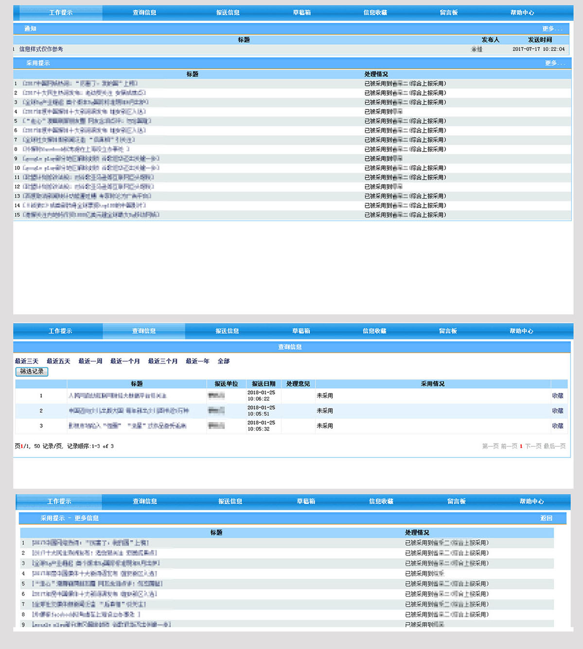 4、查询版块:能够直接筛选最近三天、一周、一月、半年、一年、全部、自定义时间等时间段的报送信息数量(包含采用或未采用情况)