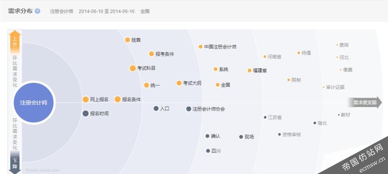 相关的内容和搜索流量需求,则可以根据此需求图谱进行内容扩展建设,比如与注册会计师相关的报名条件、网上报名(网上报名渠道)、挂靠、考试科目、考试大纲、成绩查询等方面相关的内容都可以成为主要的内容建设方向,同时根据需求图谱中所给出的目标搜索用户相关需求的强度变化以及需求度来调整各相关方向内容建设优先级的安排,以便于获得更多的目标搜索用户,同时也可以更加科学的完善网站内容。